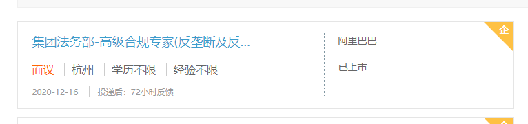 12月25日消息,市场监管总局昨日宣布依法对阿里巴巴集团控股有限公司涉嫌垄断行为立案调查。而在近日,我们在国内某招聘网站发现,阿里集团法务部早已在之前开始招聘反垄断及反不正当竞争高级合规专家。