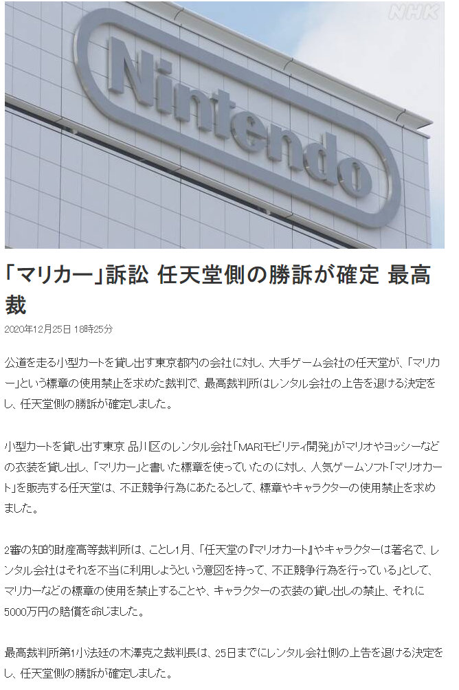 MariCar在日本是一家非常知名的卡丁车公司,这家公司通过让顾客穿扮成任天堂电子游戏中的角色并在东京街头疾驰而实现他们的“马里奥卡丁车”梦想。遗憾的是,这家公司没有通过任天堂的允许而擅自将这一想法实践,被任天堂告上了法庭,而且还被告了两次。