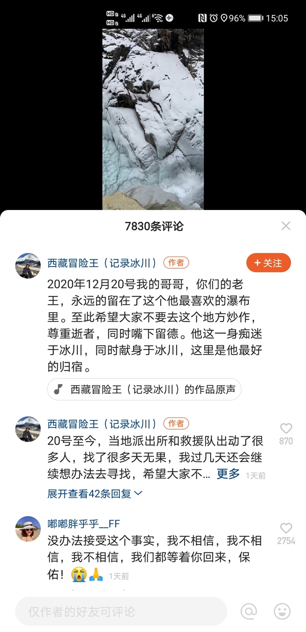 “2020年12月20号我的哥哥,你们的老王,永远地留在了这个他最喜欢的瀑布里。至此希望大家不要去这个地方炒作,尊重逝者……他这一生痴迷于冰川,同时献身于冰川,这里是他最好的归宿。”