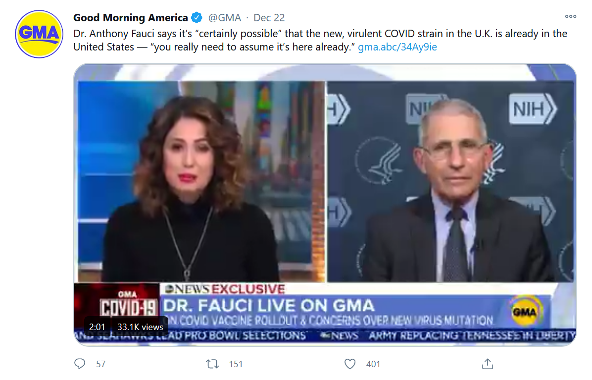 福奇在周二的Good Morning America节目的采访中指出,假设变种病毒已经在美国出现是有道理的。一些国家表示,他们已经发现了感染新毒株的患者,上周确认新毒株感染的国家数量稳步上升。B.1.1.7的突变已经传播到了英国以外的地方。该病毒最早是在9月份发现的,所以它完全有足够的时间传播到其他国家。