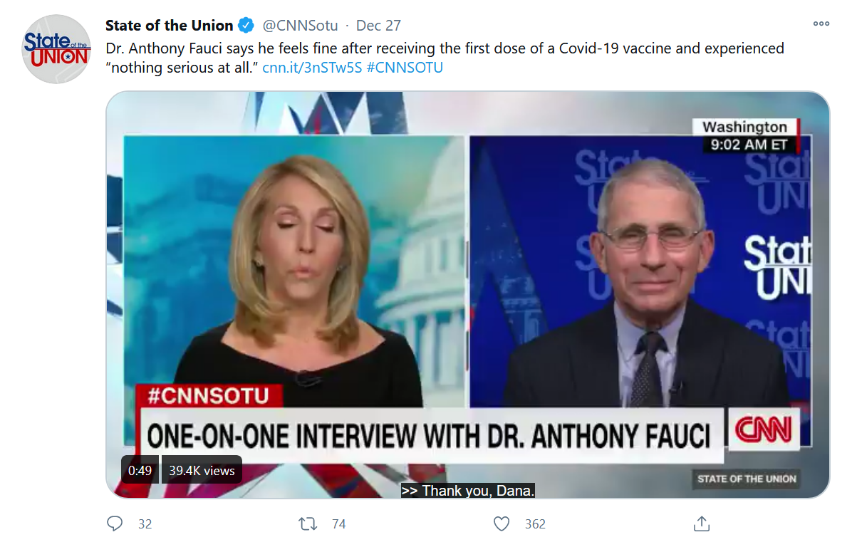 福奇在CNN的State of the Union节目中指出,官员们要求所有从英国来的人提供阴性检测证据是正确的做法。