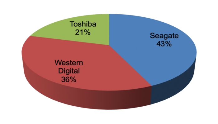 在HDD硬盘市场上,目前主要剩下希捷、西数及东芝三家公司,其中前两家规模最大,Q1希捷份额43%,西数36%,东芝则是21%,相比前两家少一半,先进技术的HDD硬盘也要落后一些。
