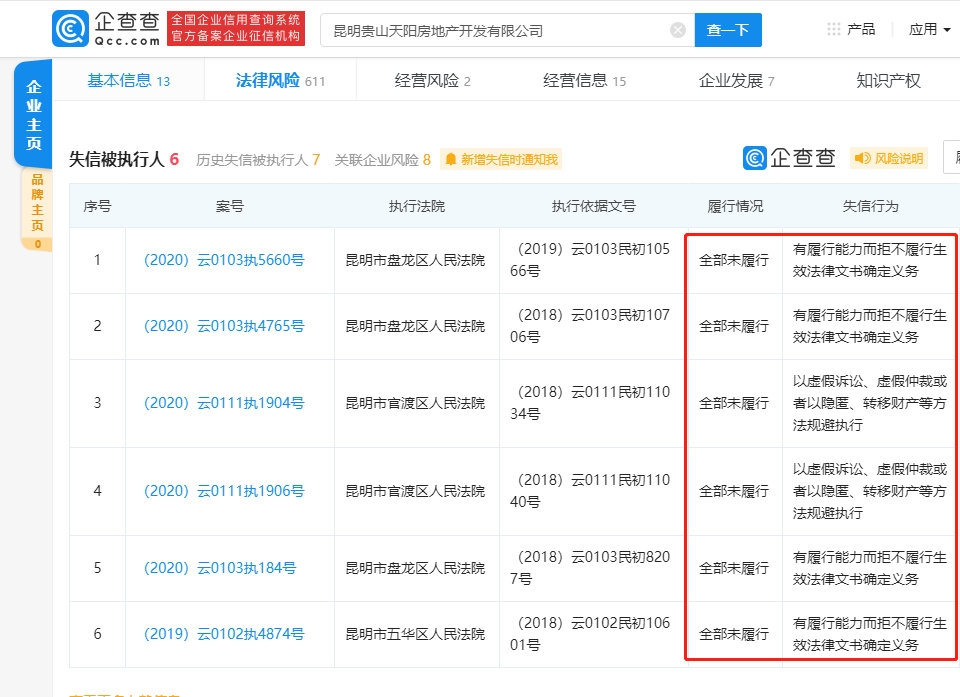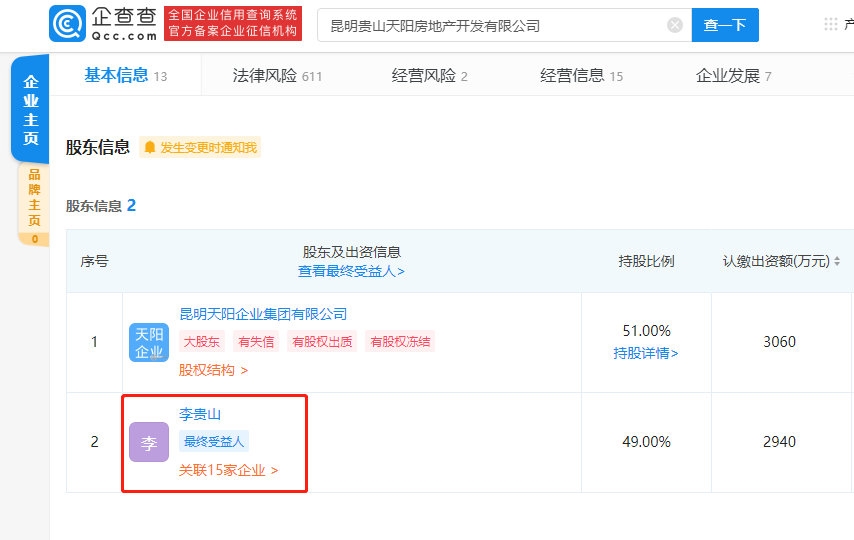 12月29日消息,企查查APP显示,昆明贵山天阳房地产开发有限公司于11月4日新增限制高消费令。目前公司已被连续限制高消费19次,因未按时履行法律义务被法院强制执行6次,涉及金额为9757万元。企查查股权穿透显示,老干妈陶华碧儿子李贵山为该公司最终受益人,持股比例为49%,认缴出资额为2940万元。
