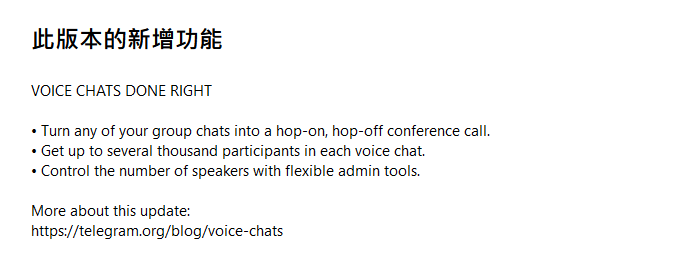 Telegram 在官方博客中写道:“任何 Telegram 小组现在都可以成为始终在线的语音聊天室。语音聊天与现有的基于文本和媒体的交流同时进行,为团队增加了一个实时的临时对话层。它们可以用作团队的虚拟办公室空间或任何社区的非正式休息室。虽然语音聊天不是群组通话,但它们可以实现相似的目标-同时提供灵活性,而不是传统的安排。在更大的群体中,他们也提供了与人交谈的偶然机会。”