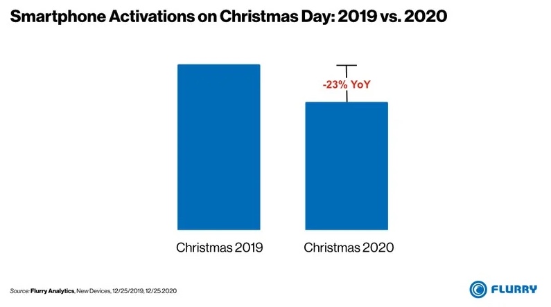iPhone 12 mini 并没有上榜,这也反映出设备可能并没有其他 iPhone 型号那么受欢迎。Flurry Analytics 的数据来自超过 100 万款移动应用。与 2019 年圣诞节相比,今年圣诞节智能手机激活数量下降了 23%。