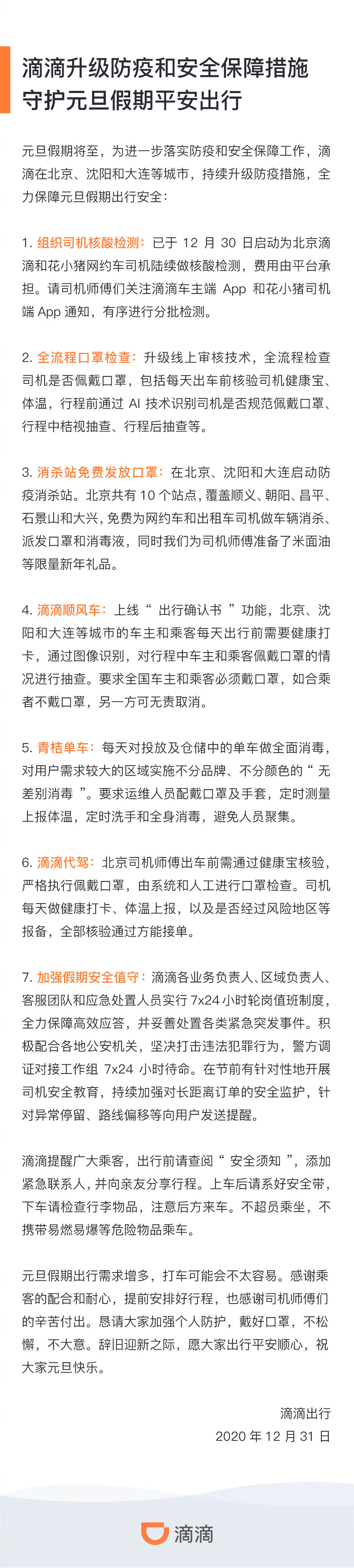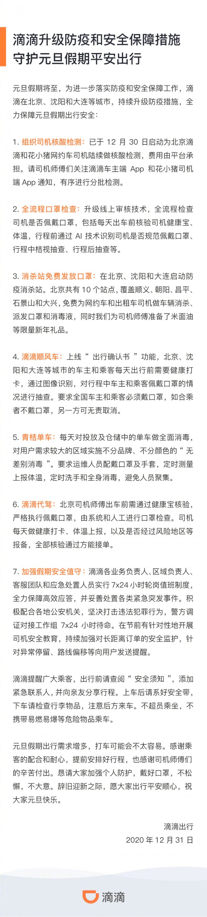 滴滴升级防疫和安全保障措施 守护元旦假期平安出行