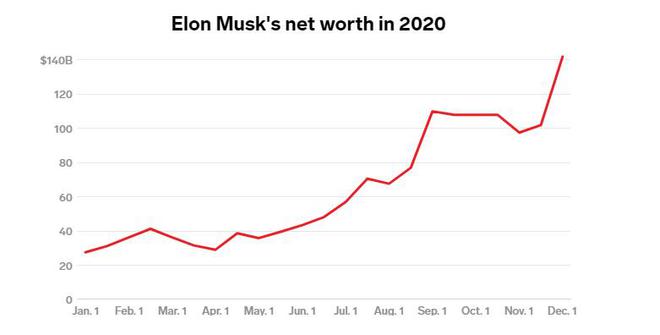 特斯拉股票是马斯克2020年净资产激增的最大来源,其股价今年飙升至新高。特斯拉已经是世界上市值最高的汽车制造商,最近接近6450亿美元。自2020年1月1日以来,特斯拉股价上涨了689%,这对马斯克来说是个巨大的利好消息,因为他持有18%的股份,轻松使他成为特斯拉的最大股东。