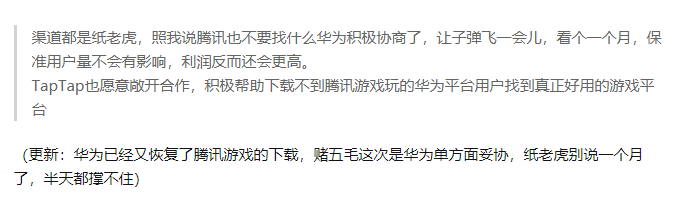 言下之意是,即便华为用户不能在应用商店下载,但腾讯可以选择和第三方平台合作,比如应用宝、 TapTap 等第三方平台。