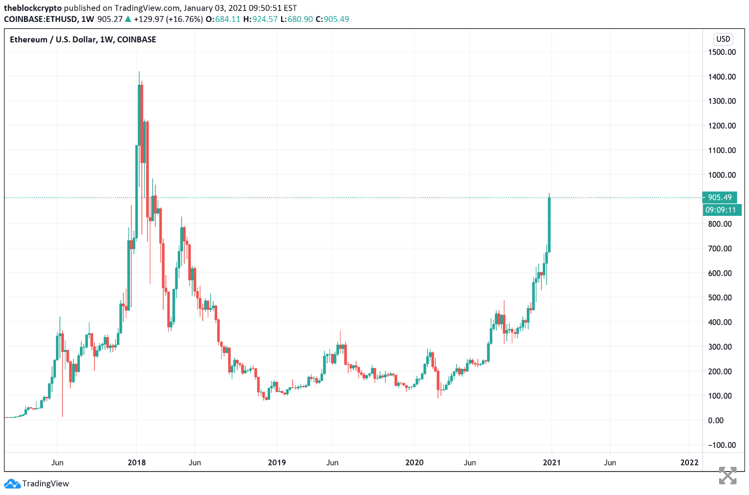 加密货币以太坊(Ether)周一达到创纪录高位,此前一天随着加密货币继续飙升,比特币首次突破34000美元关口。在周日飙升30%之后,以太坊周一进一步上涨,首次突破1000美元关口,一度达到1010美元的历史高位。
