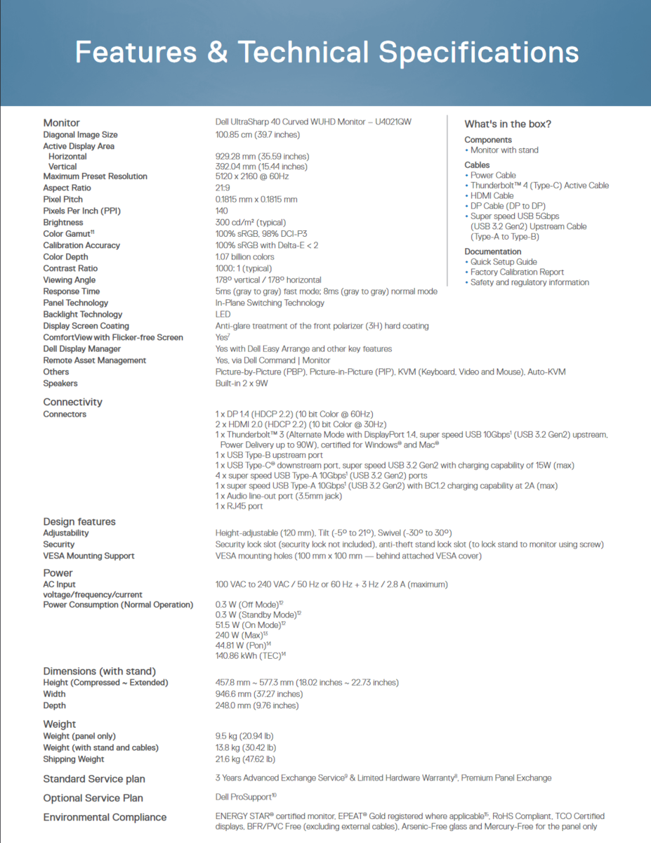 UltraSharp 40是一款2500R曲面WUHD 5K显示器,采用5210 x 2160 分辨率IPS面板,刷新率为60Hz,快速模式下灰度响应时间为5ms,具有100% sRGB、100% Rec.709和98% DCI-P3色域覆盖率,UltraSharp 40 Curved似乎是一个非常好的色彩工作选择,戴尔ComfortView Plus可以在不大幅影响色彩表现的情况下实现低蓝光发射。这款显示器除了拥有3.5毫米音频输出插孔外,还集成了双9W扬声器。