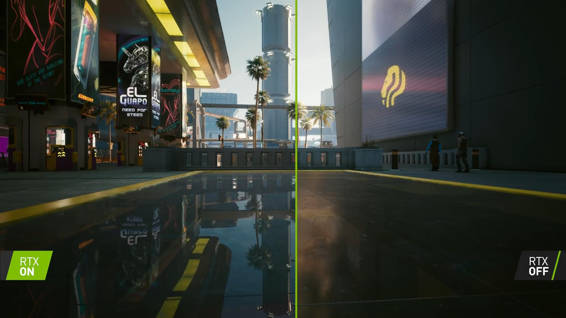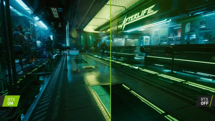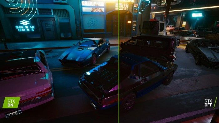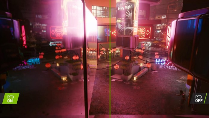 实时光追效果增强了反射、环境光遮蔽、阴影、漫射照明和全局光照效果。视频不仅展示了《赛博朋克2077》开启光追后的绝美效果,还将光追开启/关闭后的画面进行了对比,可以看到效果差异非常明显。当然玩家们需要一款强劲显卡,才能有如此出众画面。
