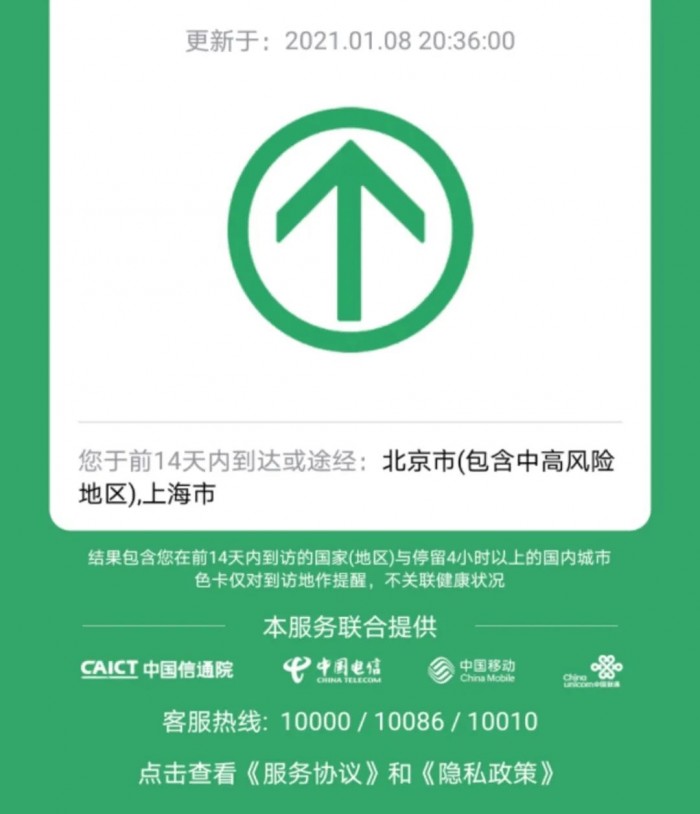 据中国信通院官微消息,2021年1月8日20时30分起,行程卡将不再对包含中高风险区域的地市名称标记为红色,变更为在城市名称后括号备注包含中高风险区域。备注仅作为出行提示,不关联健康状况,具体管控政策请遵循各地联防联控机制。