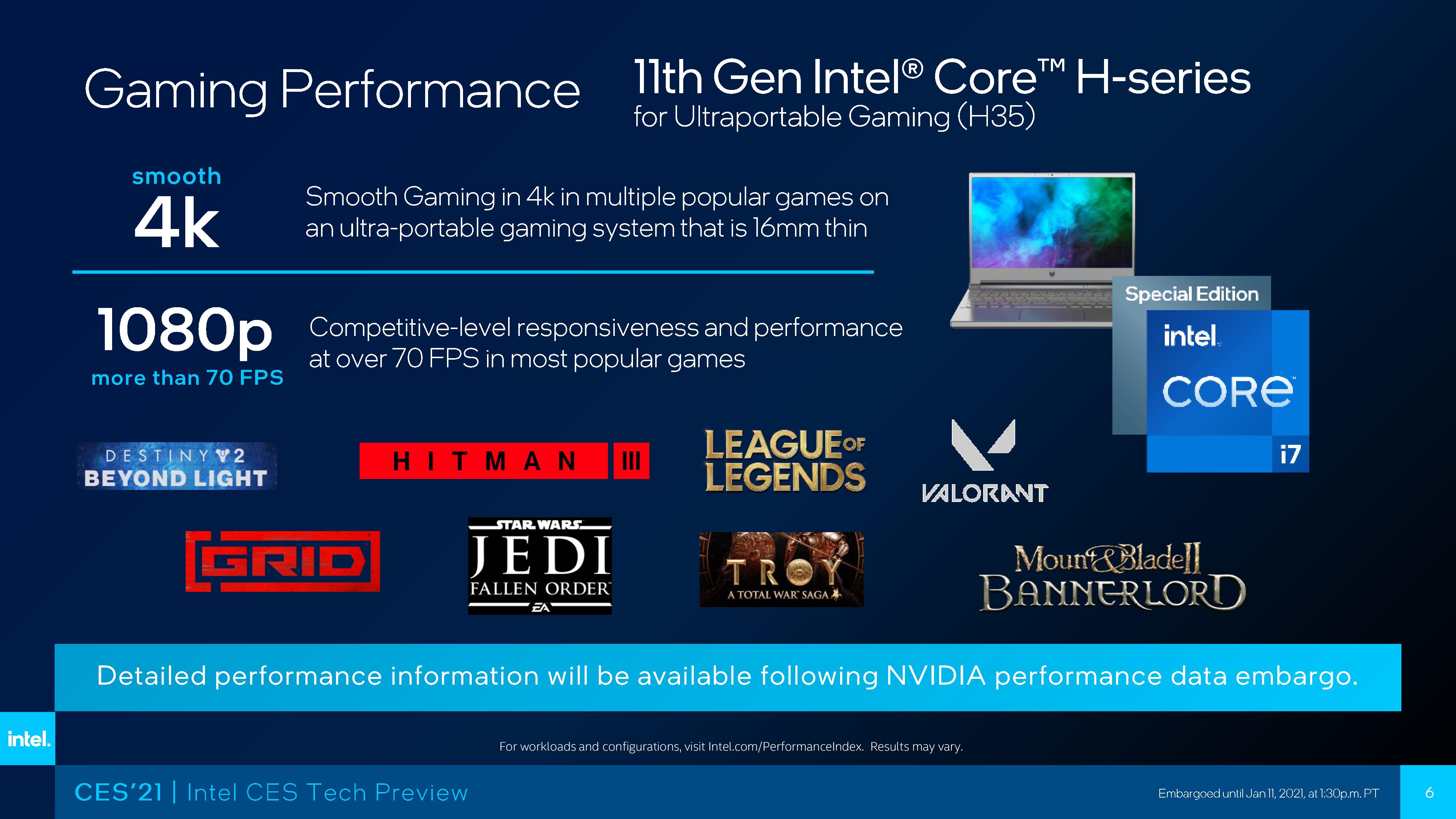 之所以要推出Tiger Lake-H35,Intel似乎是想创造一个新的细分领域,官方称之为ultraportable gaming(超便携游戏本),也就是在16mm的厚度、14寸/15寸的屏幕下提供顺滑的4K或者1080P、70FPS+游戏体验。