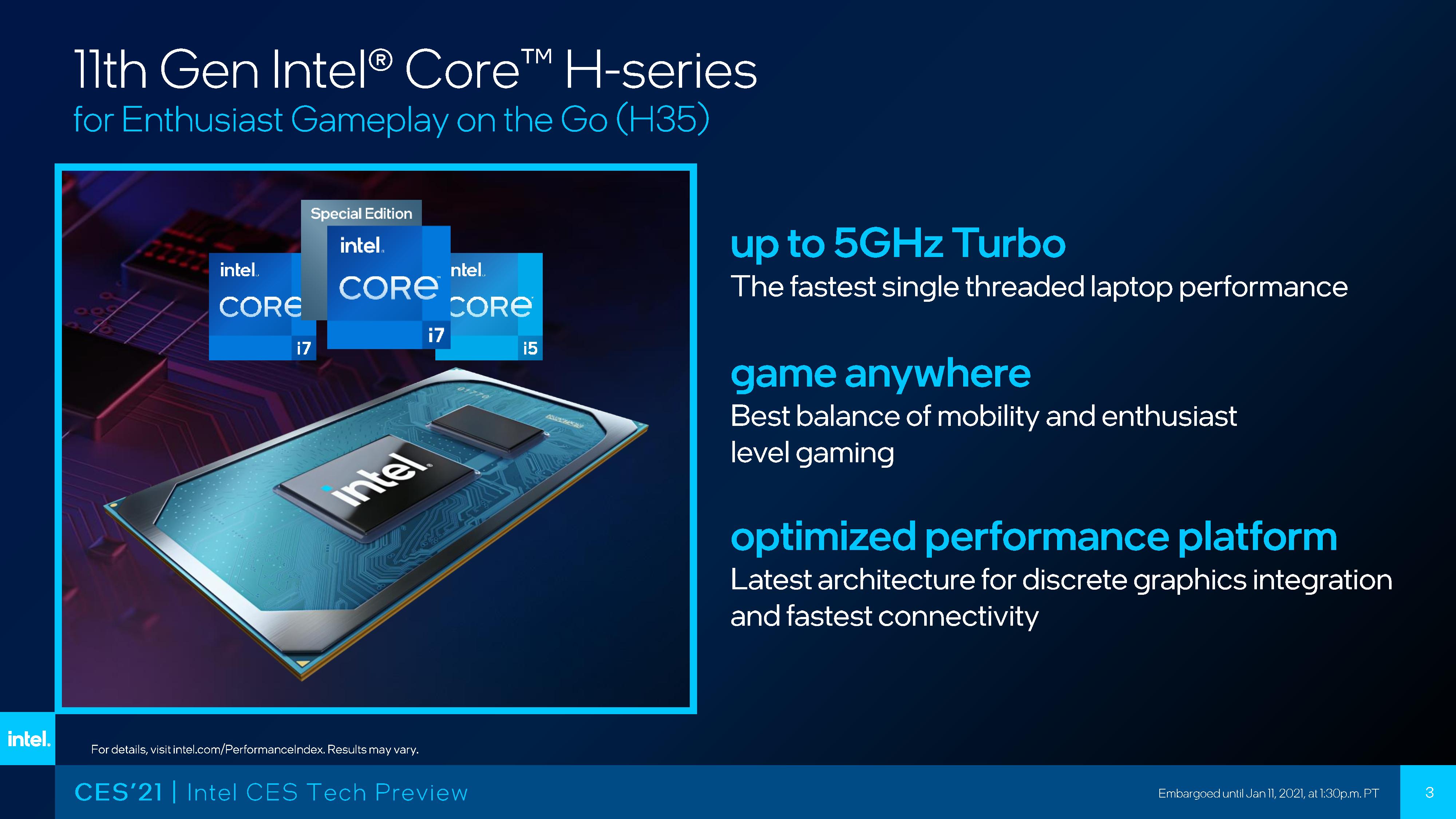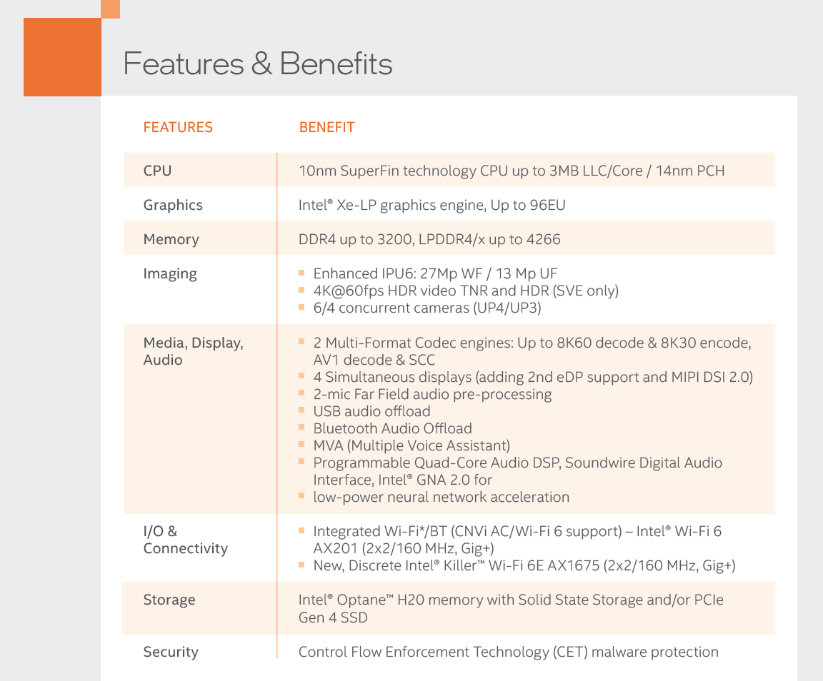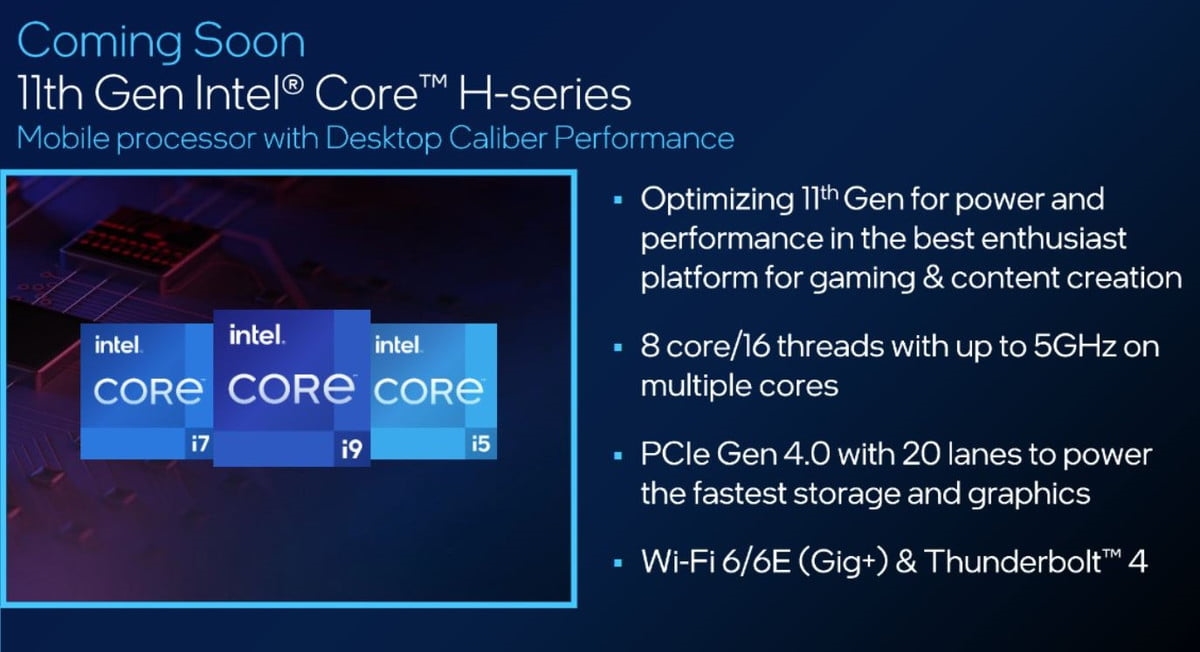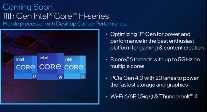 在今晨结束的CES大展上,Intel更新了笔记本处理器,分别是全新的35瓦Tiger Lake-H35系列和45瓦的标压H系列。Tiger Lake-H35应该理解为之前低电压U系列的升级版本,总共三款SKU,都是4核8线程,睿频可达5.0GHz,按照Intel的说法,将在上半年覆盖超40款笔记本。