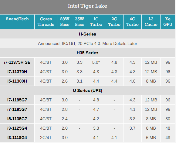 型号方面,H35系列包括i7-11375H特别版,35瓦设计下基频3.3GHz,单核睿频最高5.0GHz,12MB三缓,集成96组EU单元的Xe显卡。