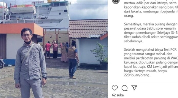 1月10日,印尼男子阿特曼·布迪·维拉万(Atma Budi Wirawan)在Instagram透露,他们一家八口原本要坐SJ182航班回坤甸,不料后来得知搭机时必须附上新冠肺炎检测证明,由于检验费用非常贵,讨论后决定改乘船回家。