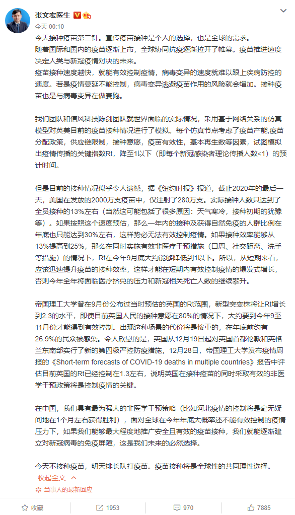 1月12日消息,上海复旦大学附属华山医院感染科主任张文宏医生今日在个人微博透露,今天他将接种疫苗第二针。他表示,宣传疫苗接种是个人的选择,也是全球的需求。随着国际和国内的疫苗逐渐上市,全球协同抗疫逐渐拉开了帷幕。疫苗推进速度决定人类与新冠疫情对决的未来。