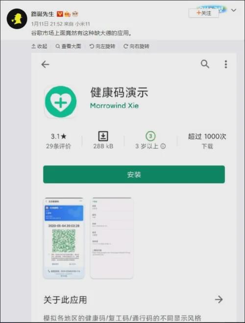全国各地推行的健康码,是疫情期间保证自己和他人安全的重要工具之一。然而,现在网络上竟然出现了模拟健康码的软件,让人不寒而栗。据微博网友@路诞先生11日透露,谷歌市场之前可以搜到一款名为“健康码演示”的软件。