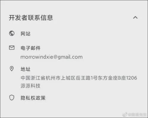 应用商店显示,这款APP开发者名为“Morrowind Xie”,其地址为杭州市上城区岳王路某科技公司。