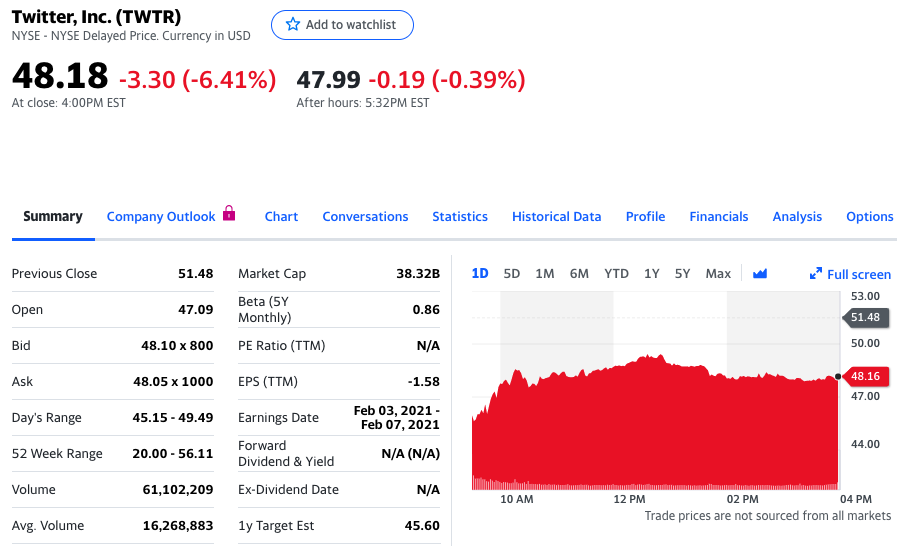 对于Twitter来说,封杀令似乎属于“伤敌一千自损八百”。周一,在Twitter宣布封杀特朗普后的第一个交易日,Twitter股价一度大跌12%,最终收跌逾6%,市值为383.19亿美元,较上一个交易日的409.44亿美元下跌了26.25亿美元。