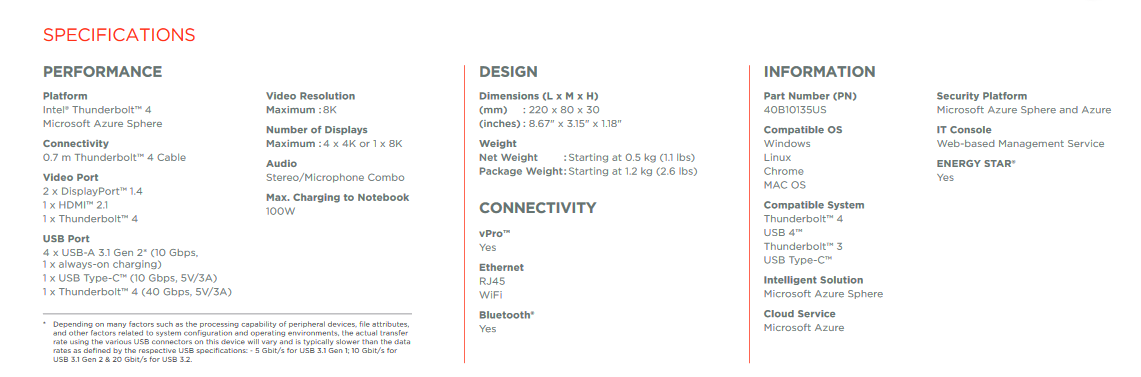 联想 Thunderbolt Smart Dock 支持最高 100W 的功率输出,且提供了对 RJ-45 有线以太网、Wi-Fi、蓝牙、以及 Intel 博锐(vPro)技术的支持。