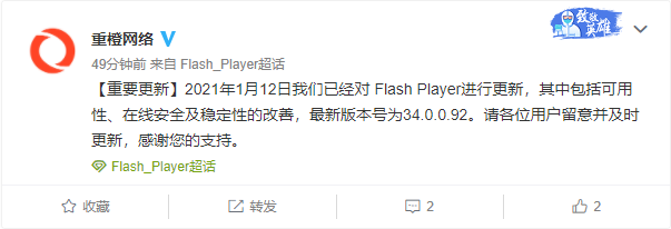 1月12日消息,重橙网络官方微博宣布,今天新版Flash Player已经更新,其中包括可用性、在线安全及稳定性的改善,最新版本号为34.0.0.92。根据重橙网络此前发布的公告,由于技术支持原因,本次及后续更新版本的Flash Player在Windows 7以下(不包含Windows 7)、Linux、Mac操作系统中不再支持视频格式内容的播放功能,其他原有功能可正常使用。