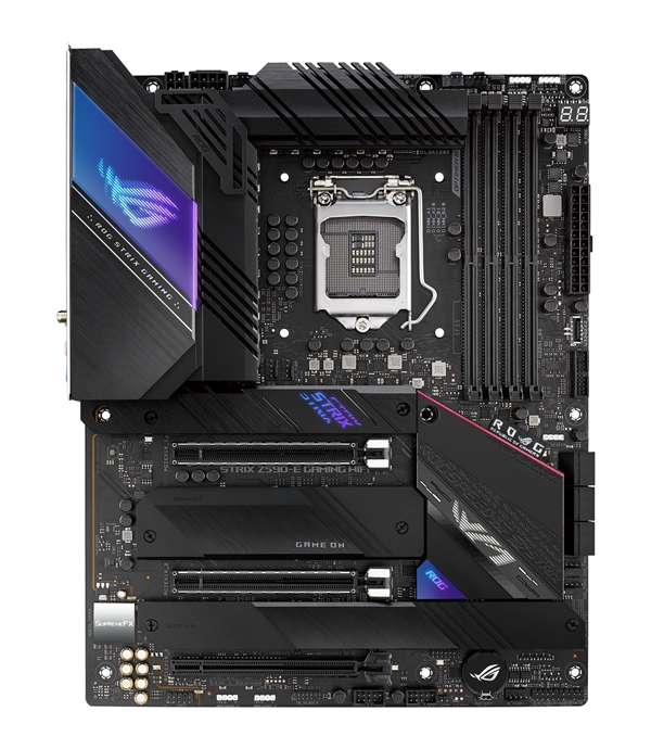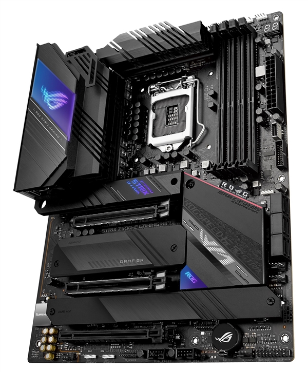 ROG STRIX猛禽系列首次亮相的是ROG STRIX Z590-E GAMING,集成时下大热的赛博朋克元素,灯效绚丽,同样支持AI智能优化2.0技术,14+2供电模组和超大散热装甲,OptiMem III内存优化技术,支持PCIe 4.0,板载雷电接针,预装ROG一体化I/O背板,4个M.2接口并覆覆高效散热片,Wi-Fi 6E无线网卡和双2.5G有线网卡,沉浸式电竞音效和SupremeFX ALC4080高品质音频芯片。
