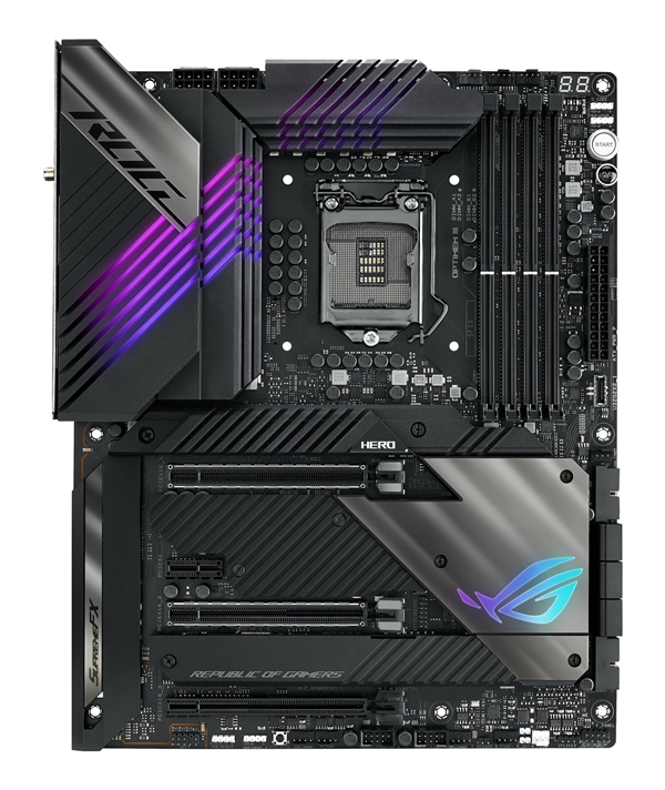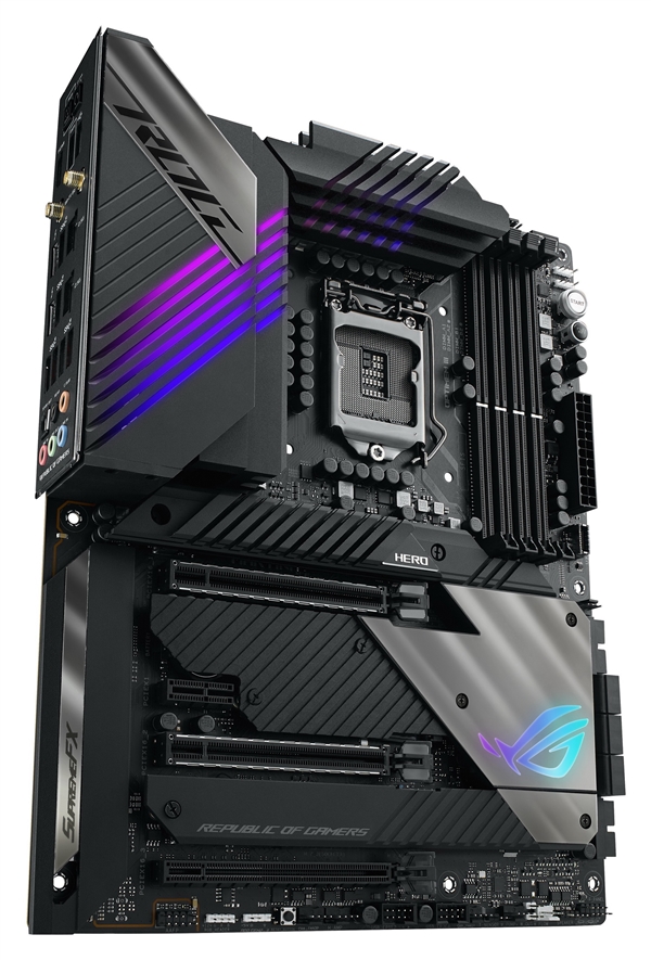 散热方面是全覆盖式装甲,包括内置热管、多组超大散热鳍片、高品质导热贴,并拥有ROG水冷控制区,可监测水冷散热器运行状态,自行调节,无需不断调试安装,M.2插槽也是加强型正反双散热。