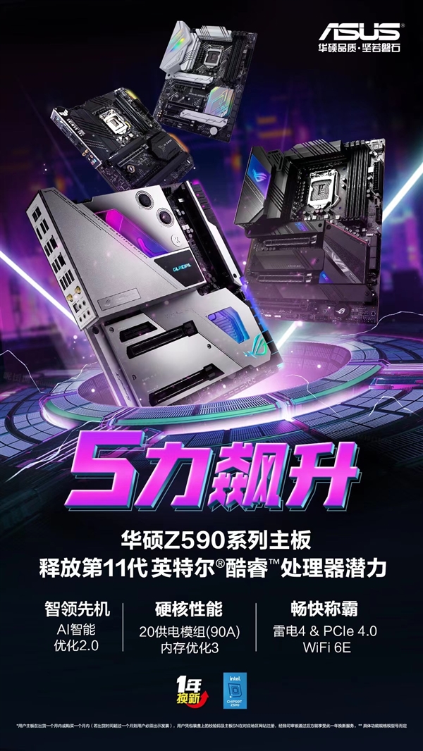 华硕Z590系列主板采用高规格供电设计,最高20供电模、90A电流,搭配双8针高强度供电接口、全方位散热解决方案,连接方面不仅支持PCIe 4.0、雷电4 Type-C接口,还拥有高达10Gb速率的万兆网卡、6GHz频段的Wi-Fi 6E无线网卡。