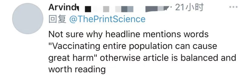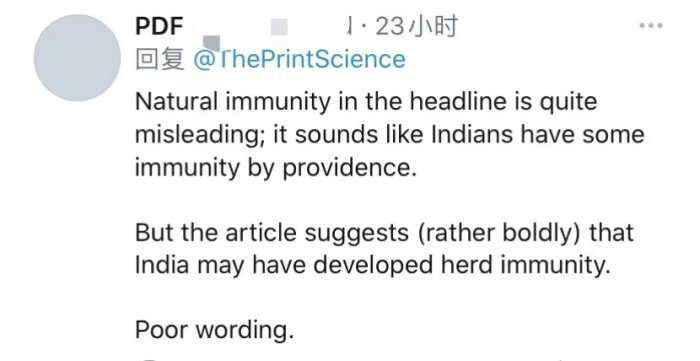 有网友在推特上留言说:“标题中的自然免疫十分误导人;听起来像是天意赋予印度人某种免疫力。但这篇文章(相当大胆地)暗示,印度可能已经发展出群体免疫力。用词不当。”↓