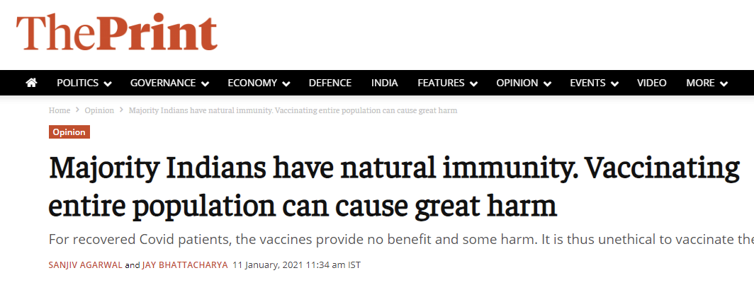 The Print:大多数印度国民具有自然免疫力,给全部人口接种疫苗会造成巨大损害