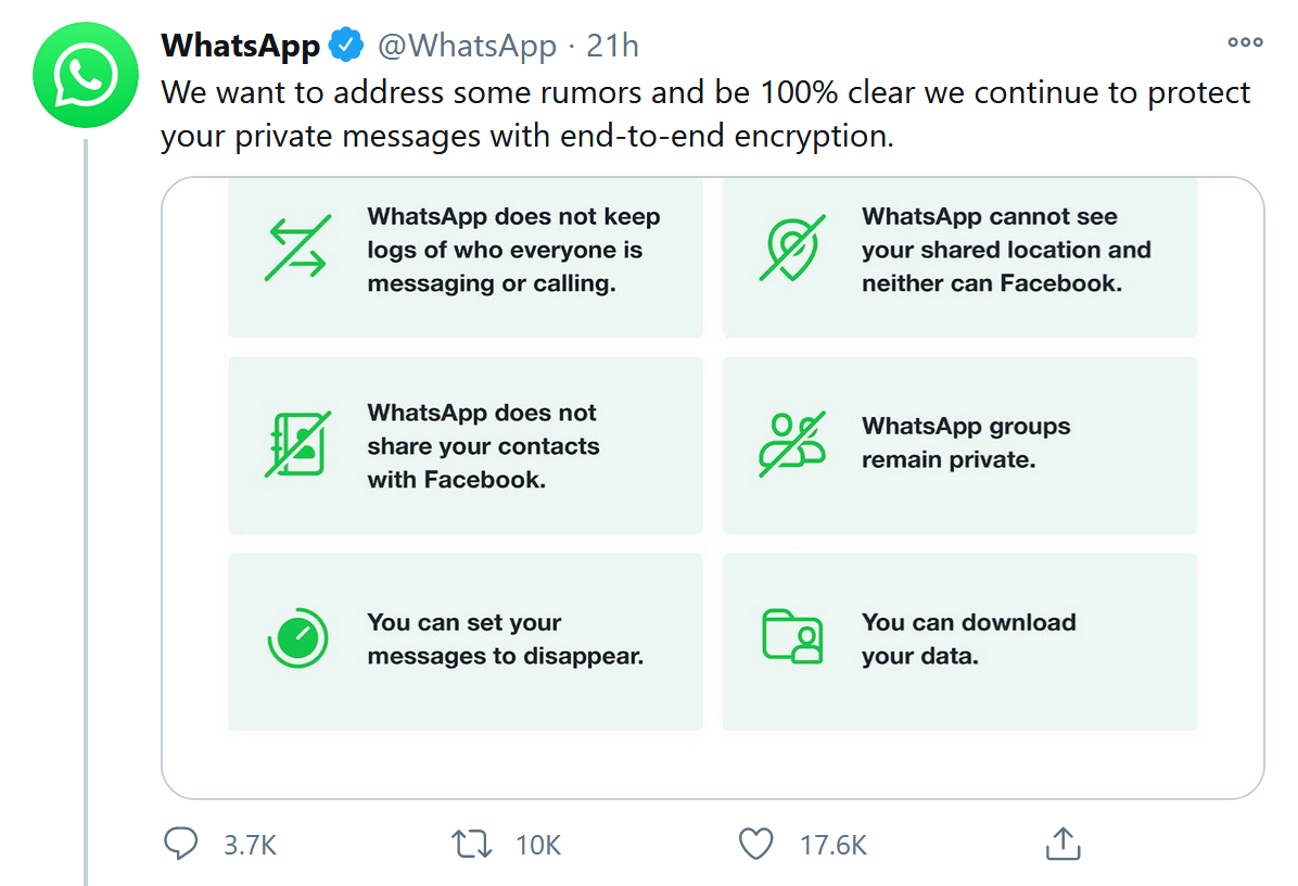 WhatsApp通过社交媒体平台向用户承诺:“我们的隐私政策更新不会影响您跟朋友或家人的信息隐私。”另外,它还新增了FAQ以解决用户跟Facebook共享数据有关的隐私问题。