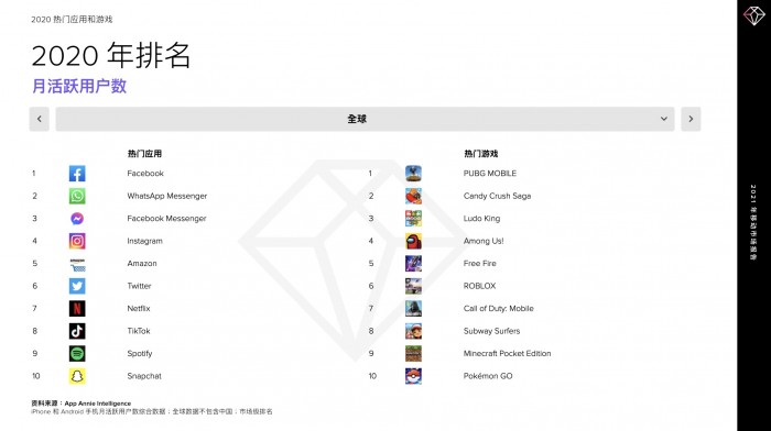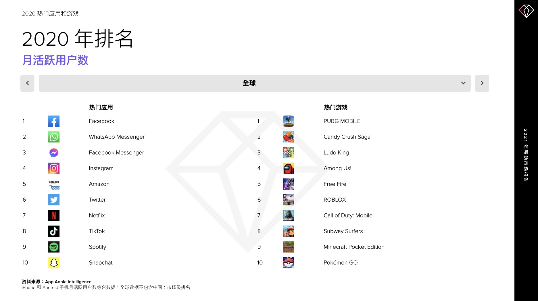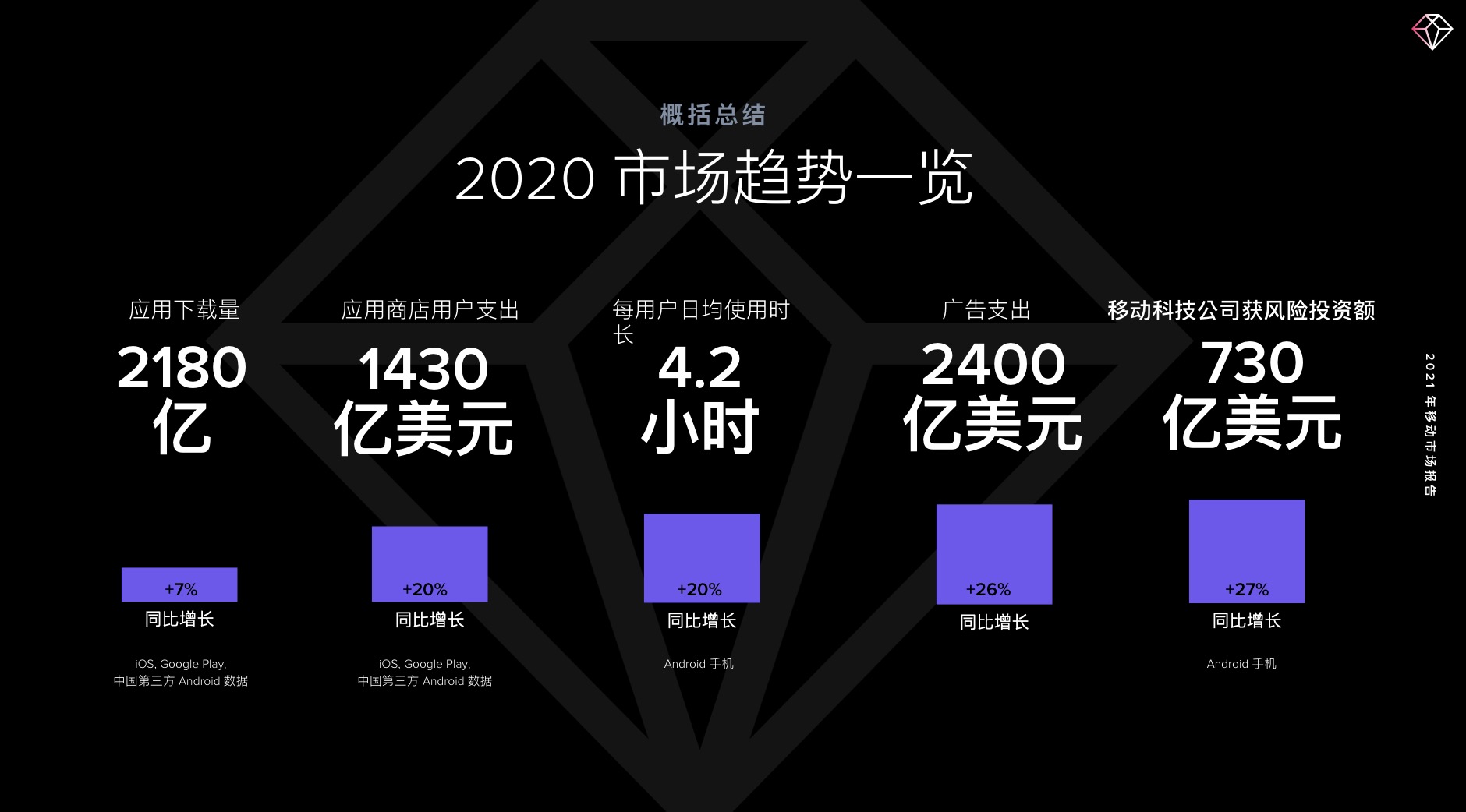 App Annie 发布了《2021 年移动市场报告》。这份年度报告分析了移动设备对各行业和全球经济的广泛影响。2020 年,随着新冠肺炎疫情席卷全球,消费者使用移动设备来保持联系、工作、学习、娱乐和放松,移动设备使用量加速增长。