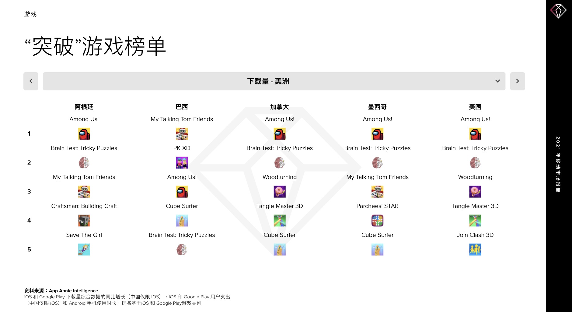 移动游戏逐渐成为市场主流,硬核玩家在家会选择移动设备游戏。硬核游戏玩家在移动游戏中占据了 66% 的用户支出以及 55% 的使用时长,其中休闲游戏在下载量排行榜中独占鳌头,比如《Among Us》、《ROBLOX》和《会说话的汤姆猫》等简单好玩的游戏都拥有极高的人气。