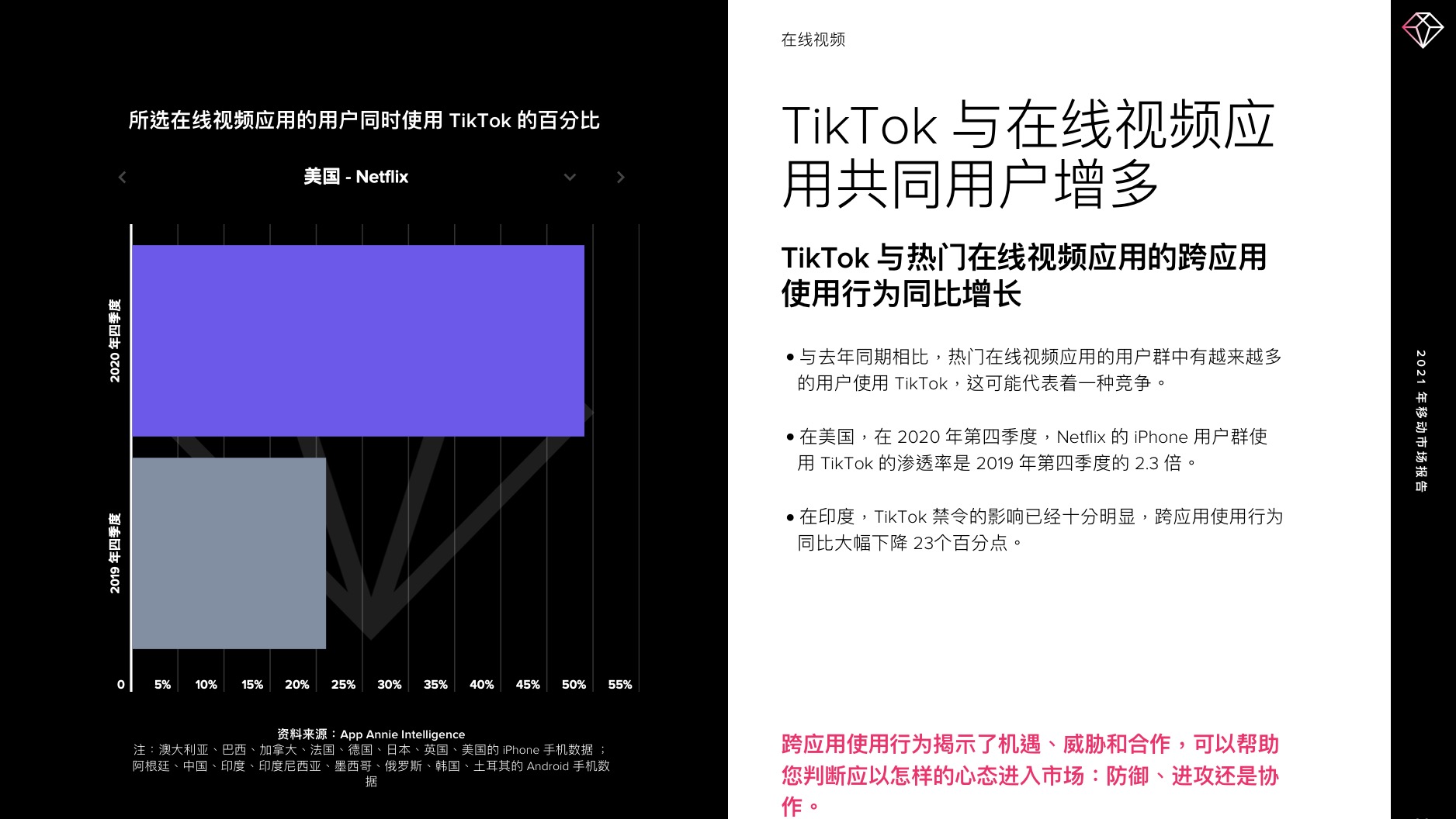 2020 年,移动端在线视频播放时长总体增长 40%,其中TikTok 的每用户使用时长同比增长高达 325%。与去年同期相比,热门在线视频的用户群中越来越多用户开始使用 TikTok。App Annie数据显示,与 2019 年同期相比,2020 年第四季度美国Netflix 的 iPhone 用户使用 TikTok 的渗透率达到 2.3倍。