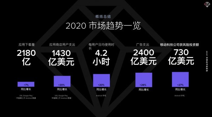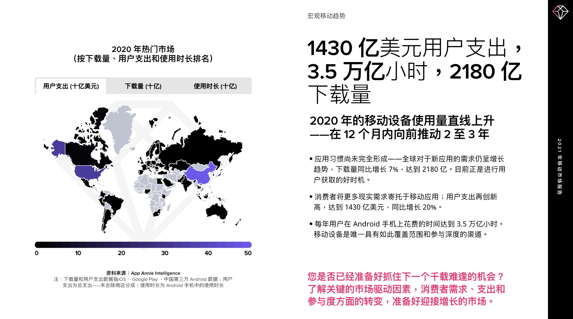 报告显示,受疫情影响,2020 年的移动设备使用量直线上升,用户总量在不到 12 个月内向前推动了 2 至 3 年。随着用户群的增长,应用数量也随之不断增多,移动应用市场呈现一片生机勃勃的景象。回顾过往一年,全球移动市场用户支出累计达约1430 亿美元,使用时间累计达3.5 万亿小时。而相比去年,移动应用下载量同比增长7%,达到 2180 亿。可见用户使用习惯尚未完全形成,全球对于新应用的需求仍呈增长趋势,目前正是获取用户的好时机。