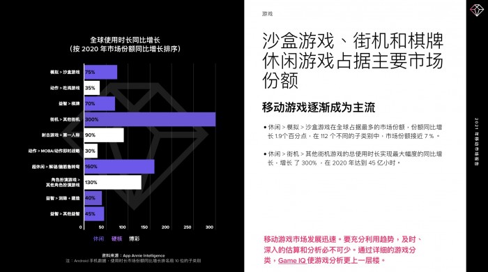 沙盒游戏、街机和休闲三类游戏占据主要市场份额。休闲 、模拟和沙盒游戏在全球占据最多的市场份额,同比增长 1.9 个百分点,在 112 个不同的子类别中,市场份额接近 7 % 。而休闲和各种街机游戏的总使用时长实现了300%的同比增长,达到45亿小时。