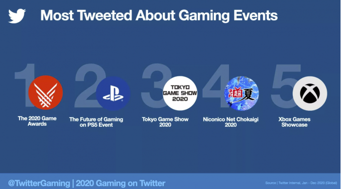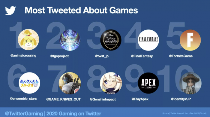 动物之森是推特上谈论最多的游戏,其次是Fate/Grand Order,后者是2015年的一款日本免费手机游戏,在国内非常受欢迎,截至2019年全球总收入超过40亿美元。随着去年各大会议的数字化,有很多游戏活动可以在推特上发布。2020年游戏大奖活动在推特上最受欢迎,PS5上的未来游戏活动次之。