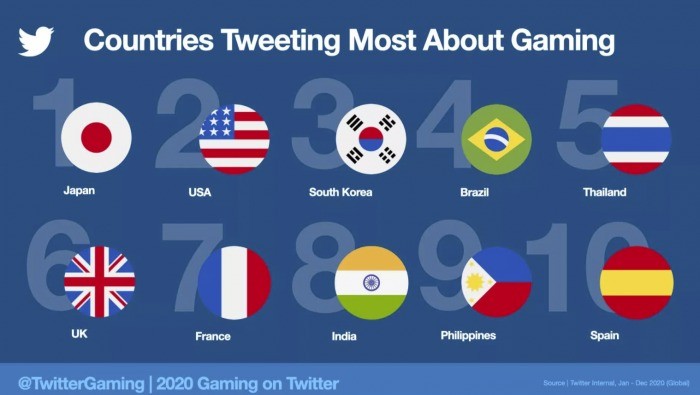 游戏是推特上最受关注的第六大话题。在该类别中,最受关注的话题依次是游戏,游戏新闻,电竞,游戏影响者,游戏机,堡垒之夜,使命召唤,Minecraft,动物之森和Xbox。虽然人们可能会认为美国的游戏推文数量最多,但它排在日本之后,位居第二。前六名的其他国家包括韩国、巴西、泰国和英国。
