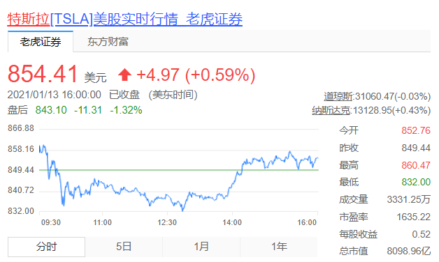 截至到美东时间1月13日收盘,特斯拉股价报收854.41美元,总市值突破8千亿美元,达到8098.96亿美元。