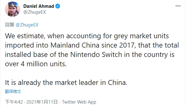 分析师丹尼尔(Daniel Ahmad)表示,“在我们计算Switch在 “灰色市场”的销售量时,任天堂Switch的安装量,自2017年以来,国内应该已经超过了4百万套,已经是中国市场的领军者了”。