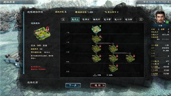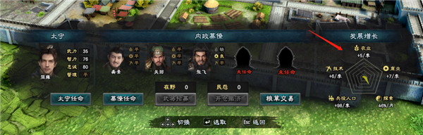 而升级据点需要玩家在该据点的武将满足一定的数值,每个武将都有商业、农业、技术、管理等属性。