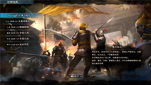 选择开启新的存档后,按照惯例需要选择在什么时期开始游戏,我一般都喜欢黄巾起义开始,因为随着时间的发展,可以把所有知名武将都收集到手。