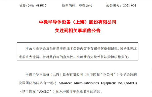 1月15日消息,中微公司在上交所发布公告,今早关注到美国国防部网站有一则将Advanced Micro-Fabrication Equipment Inc. (AMEC) 加入中国涉军企业名单的消息。AMEC 被列入中国涉军企业名单后,美国人士将被限制对 AMEC 所发行的 有价证券及其相关的衍生品进行交易: