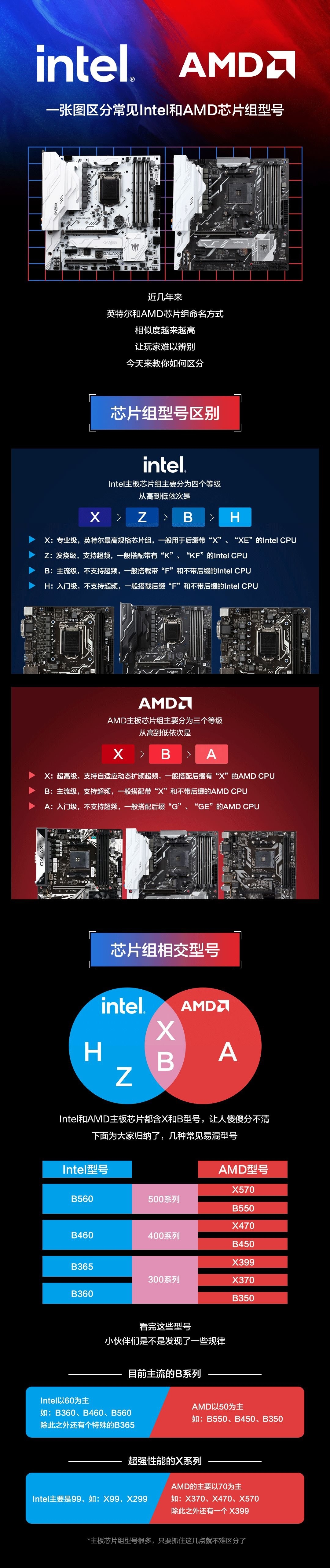 大家应该注意到了,Intel、AMD芯片组都有X、B系列,其中AMD X对标Intel X/Z,AMD B对标Intel B,后者尤其乱。