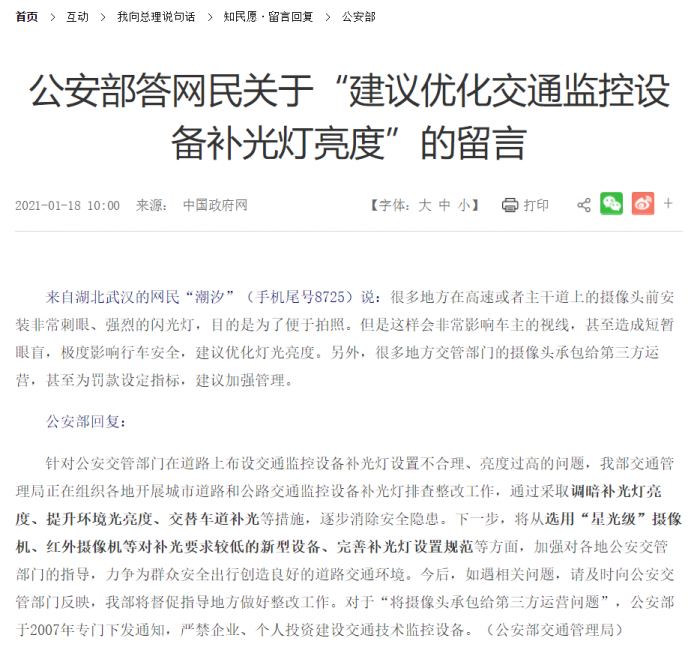 日前,对于网友留言问题,公安部也进行了回复:针对公安交管部门在道路上布设交通监控设备补光灯设置不合理、亮度过高的问题,我部交通管理局正在组织各地,开展城市道路和公路交通监控设备补光灯排查整改工作。