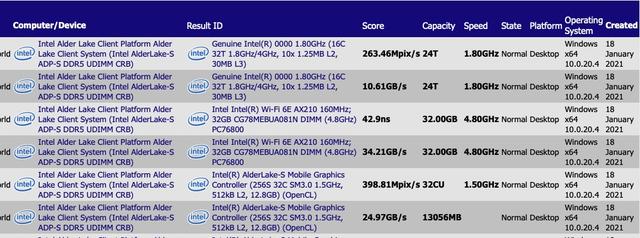 数据显示,这款英特尔12代酷睿 Alder Lake为16核,1.8-4GHz,30MB三级缓存;配备了32GB DDR5-4800内存;核显为32EU(256 流处理器),GPU频率1.5GHz。