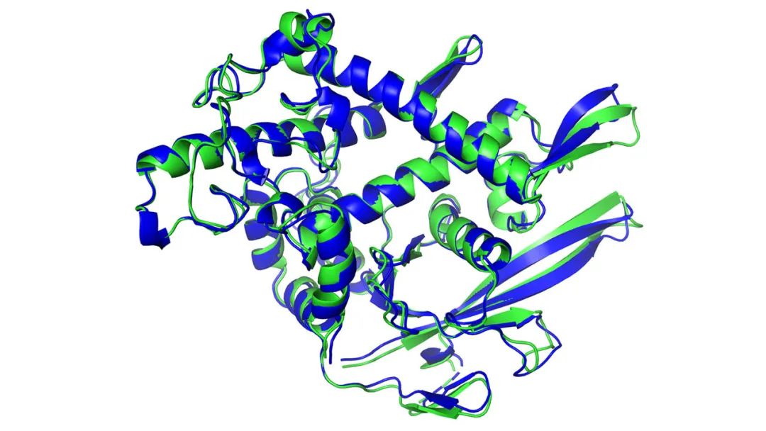 蓝色为计算机预测的蛋白质结构,绿色为实验验证结果,二者相似度非常高。