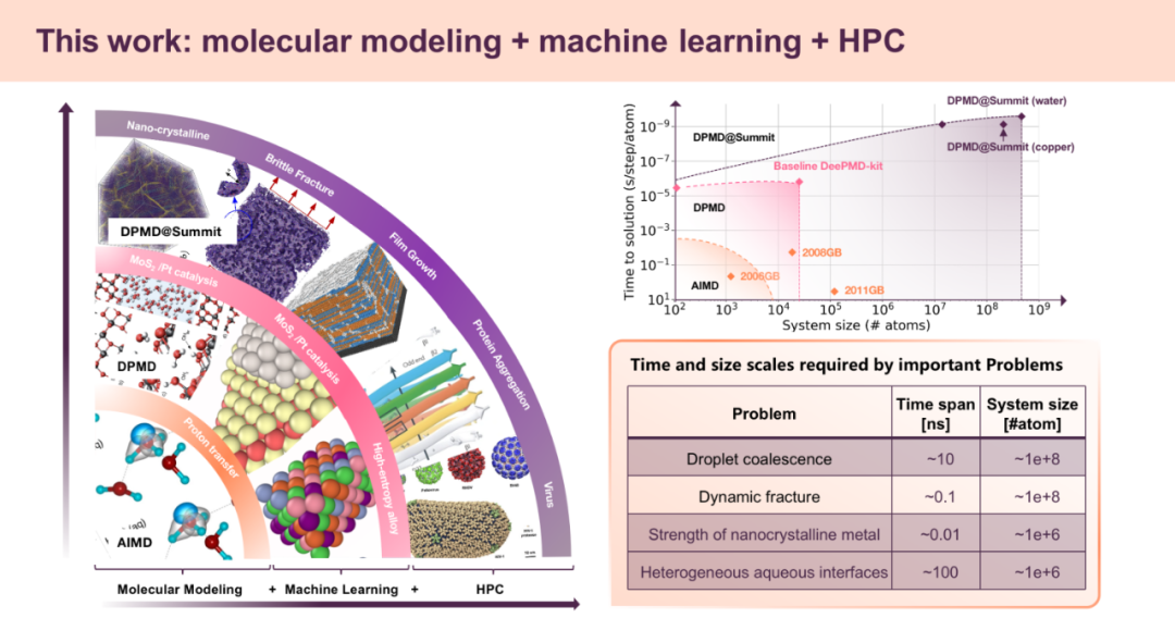 该成果通过高性能计算和机器学习将分子动力学极限提升了数个量级,达到了上亿原子的体系规模,同时仍保证了“从头算(ab initio)”的高精度,且模拟时间尺度较传统方法至少提高1000倍。