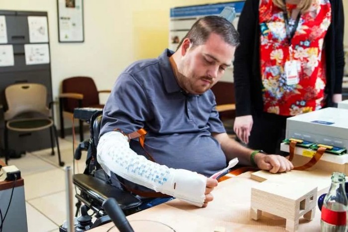 在2010年遭受严重脊髓损伤后,伊恩·伯克哈特在他的运动皮层植入了微型芯片,将大脑电信号转到电脑上控制手臂,使其能够再次抓住和感觉物体。图源/Battelle Memorial Institute